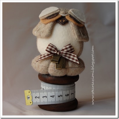 Il primo è un gufetto appoggiato su un cuscino puntaspilli e con sotto un rocchetto portametro (il rocchetto l’ho trovato per puro caso in un altro stand ed era perfetto per questo progetto!).